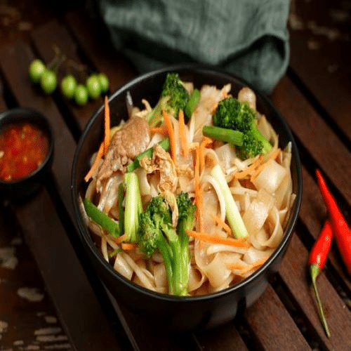 Boeuf, bambou, haricots verts, lait de coco, basilic, poivrons verts et rouges. Servi avec un bowl de riz.